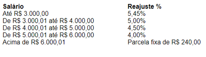 Os salários serão reajustados pelo índice de 5,45% (cinco inteiros e quarenta e cinco centésimo por cento), podendo as empresas a seu critério, escalonar o reajuste por faixa salarial conforme tabela abaixo: